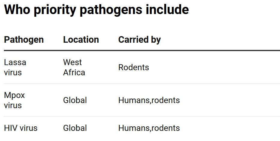 Those supposed diseases caused by and carried by rats are listed in the table above. Of course, officially, the Black Death is caused by the bacteria Yersinia Pestis, so the media are obscuring the truth as is their custom. The WHO has promoted several deadly viruses that are supposedly carried or caused by rodents into the top ten list. Clearly, the WHO does not know what caused the Black Death, but the term itself carries with it such a potent effect that it makes a good headline and enables them to increase the perceived threat level among the gullible members of the public, of which there are billions.